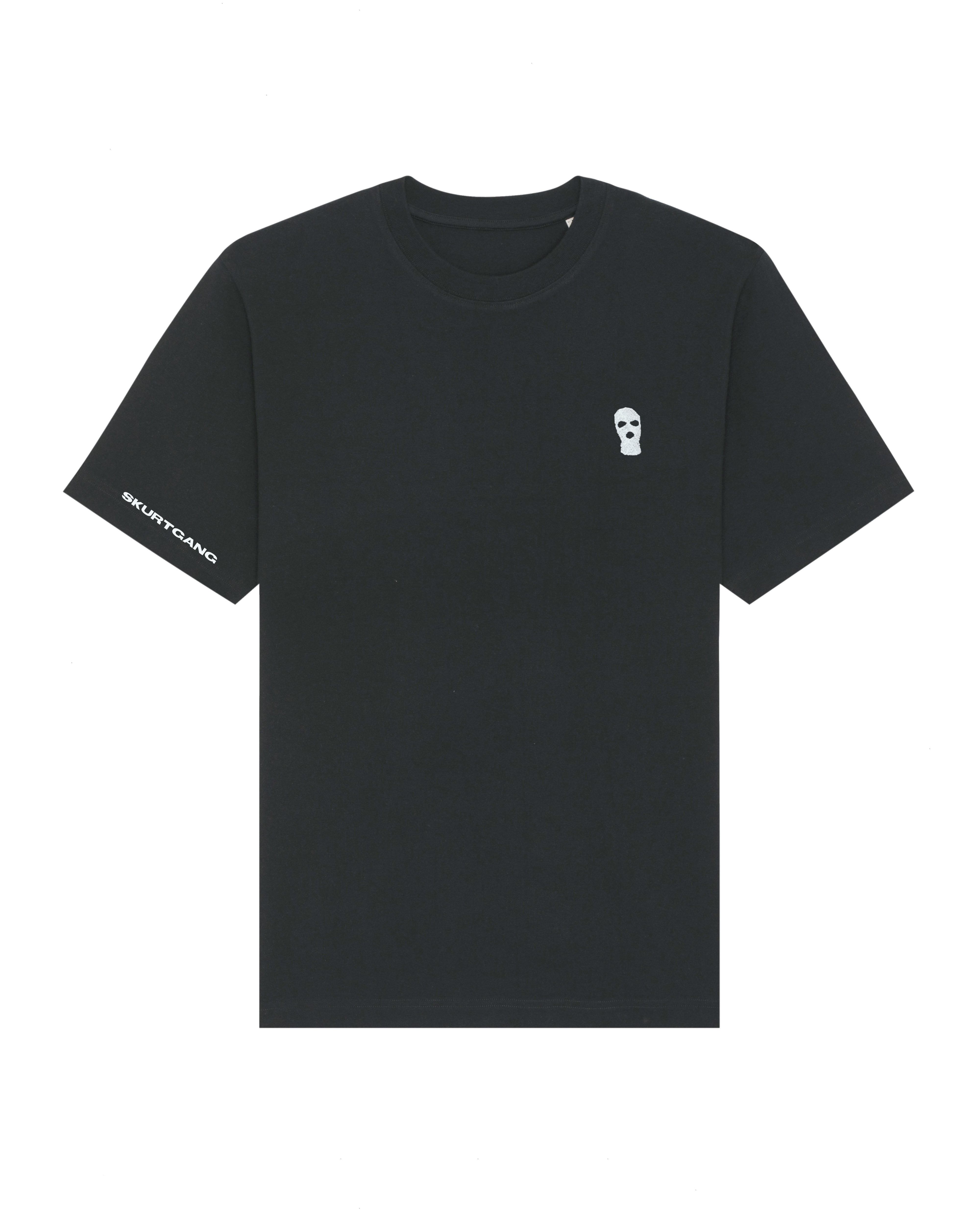 Tee shirt “Skurtgang” with balaclava logo in white at front. White “Skurtgang” on a right sleeve. Oversized fit
